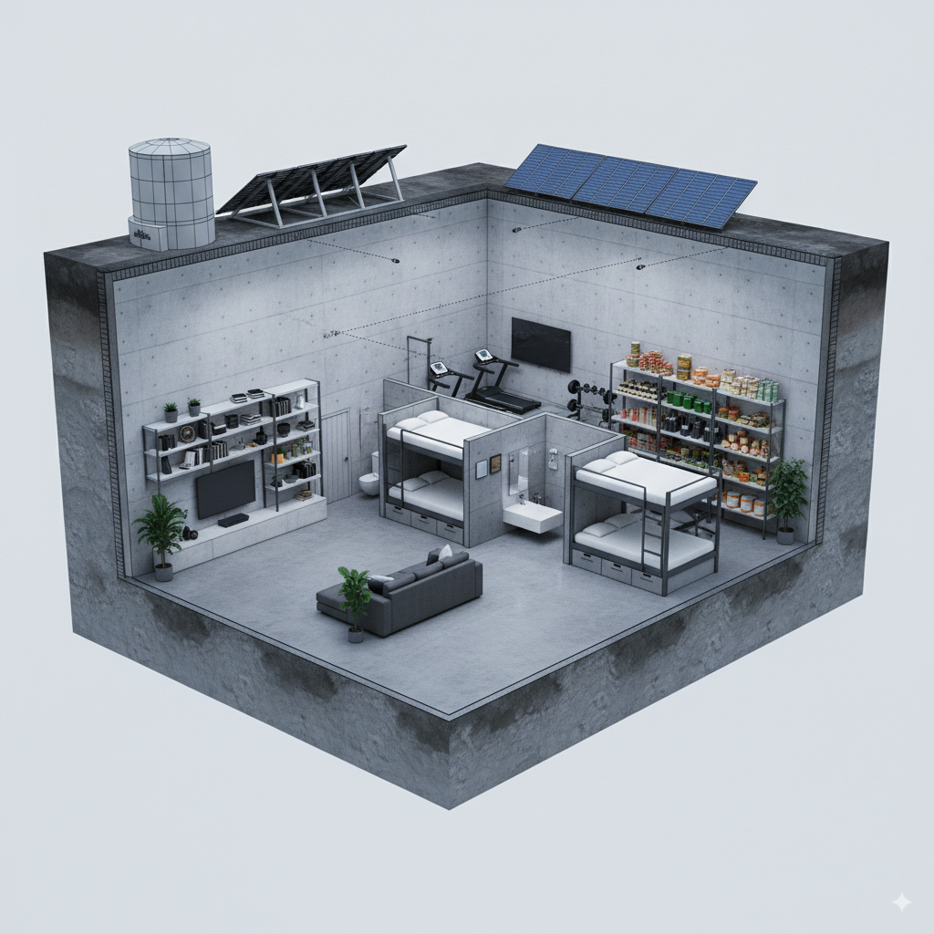 Este espacio convierte al búnker en un entorno autosuficiente y sostenible, asegurando el abastecimiento básico durante semanas o incluso meses, sin depender del exterior.